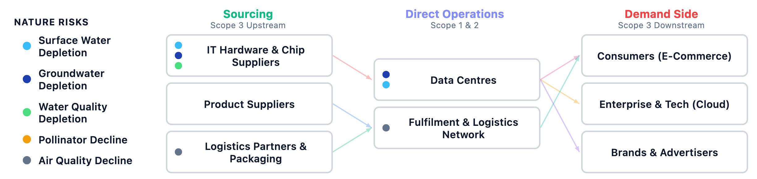 To derive company-level NVaR results, we have developed an approach for assessing how nature risk transmits through a company’s value chain, based on its structure, activities and specific vulnerabilities. We trace risk from upstream suppliers (Scope 3) through direct operations (Scope 1) to end markets, considering shocks across five ecosystem services that are highly material across a wide range of economic sectors: groundwater, surface water, water quality, air quality and pollination. To ground these results, we first map out where we expect nature risks to emerge, as illustrated for two large companies in very different sectors: agri-foods and technology.