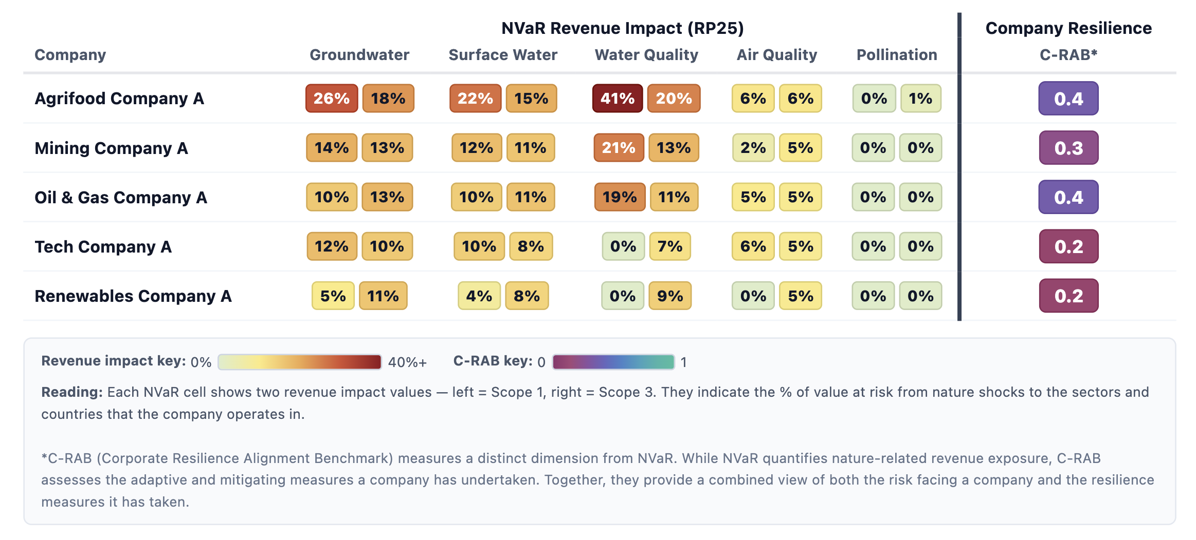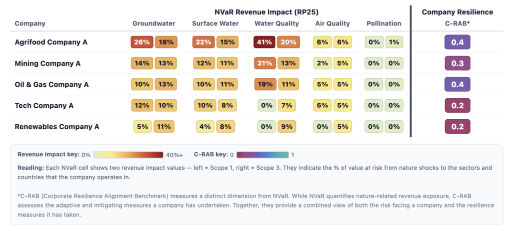 NVaR gives an objective measure of the risks faced by a company given its sector, asset and revenue structures and spatial characteristics, but it does not provide information on how well prepared that company is. This is where a complementary tool developed by the EarthCap team, Corporate Resilience Alignment Benchmark (C-RAB), plays an important role. C-RAB assesses company disclosures to evaluate where a company sits relative to its peers in terms of its management of nature-related dependencies and its preparedness. Together, NVaR and C-RAB provide a holistic view of company-level nature risk.