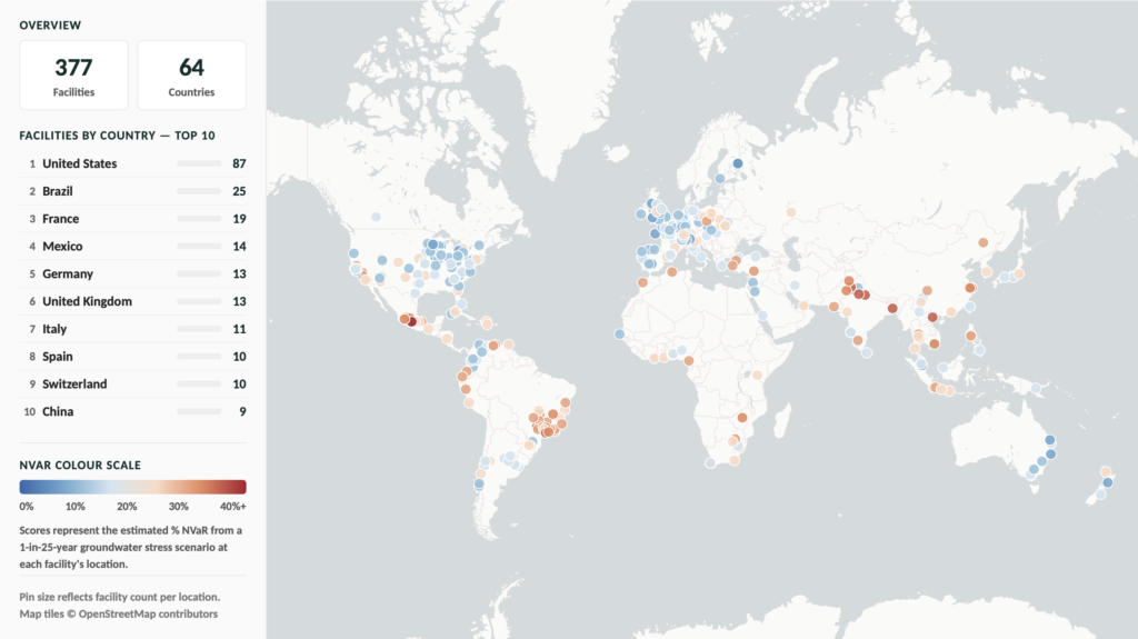 While existing nature scores available to investors typically rate company policies or supply chain exposure qualitatively, NVaR expresses risk in terms of potential revenue loss under a defined stress scenario, based on each company’s activities, geographical footprint and supply chain. Under a 1-in-25-year water scarcity scenario, for example, a food manufacturer in a water-stressed region could lose 26% of its revenues.