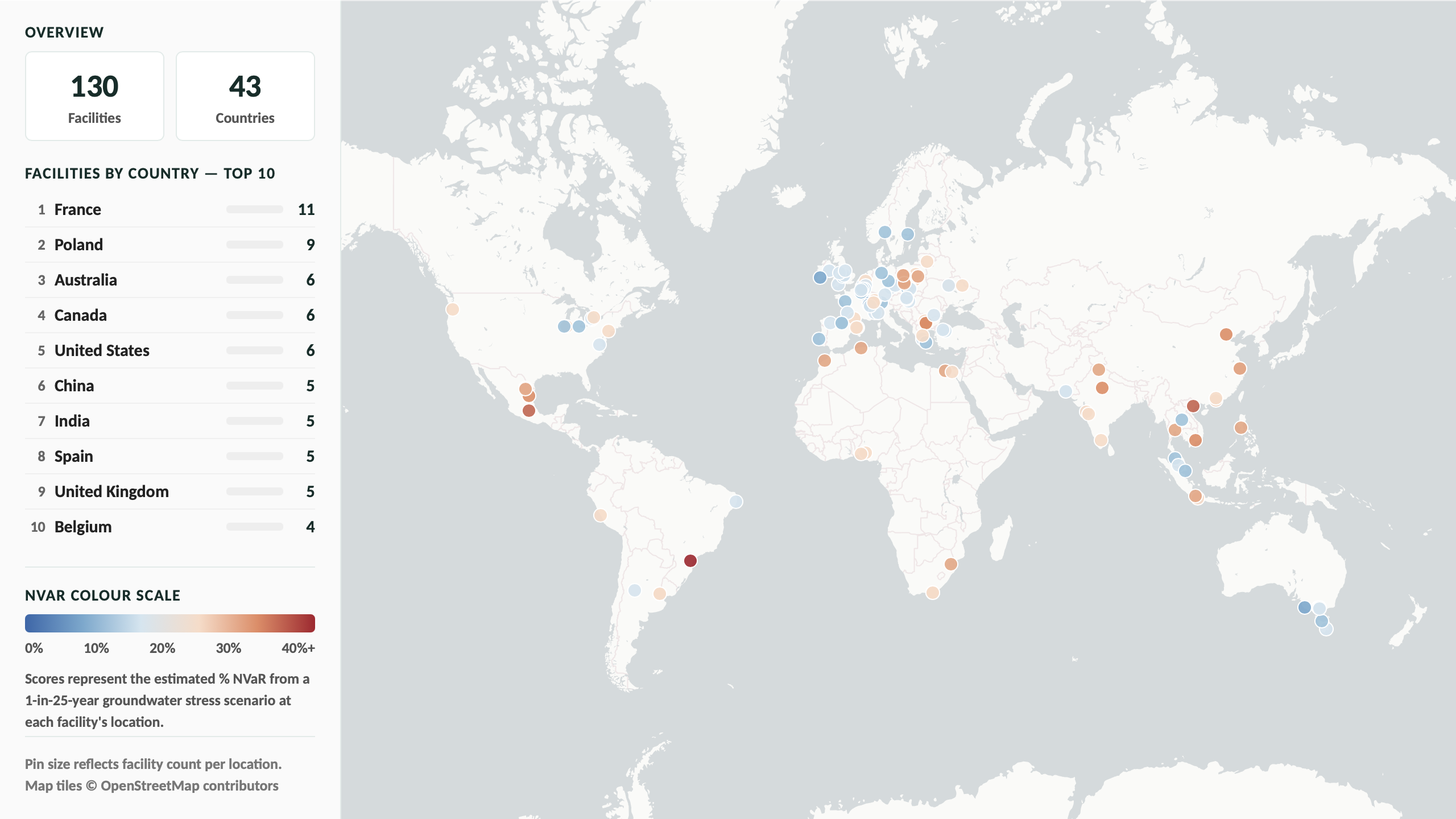 Our mapping reveals significant variation at the facility level. Individual plants in central Mexico, northern India and parts of Southeast Asia face groundwater potential revenue risks of above 40%, while facilities in Northern Europe and parts of Oceania sit below 15%. This variation is invisible at the country-average level, underscoring the importance of granular asset location data in producing accurate estimates of nature risk at the company level.
